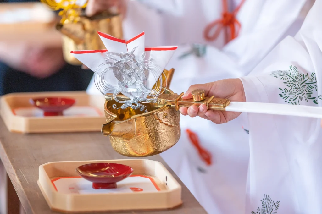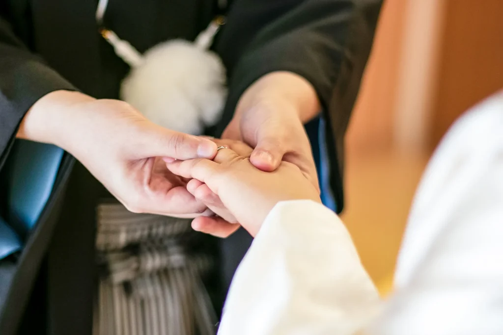 結婚の誓い:式の中で、夫婦となる二人が誓いの言葉を述べ、**三三九度(さんさんくど)**という、結婚の証として酒を交わす儀式を行います。これは、永遠の絆を誓う象徴的な儀式です。