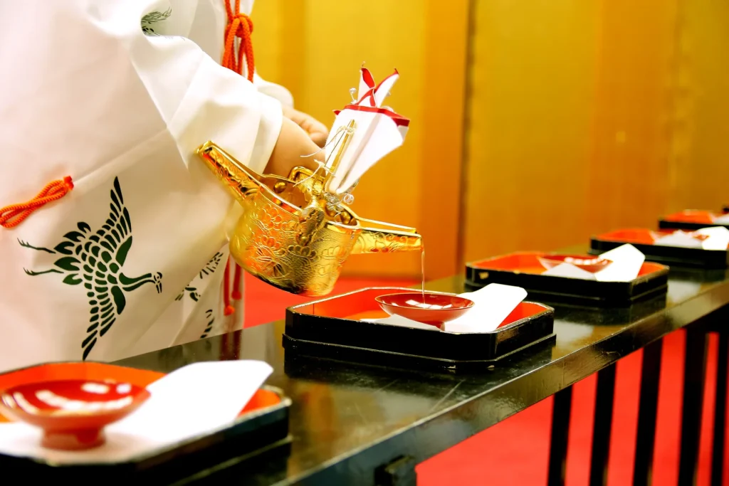 結婚の誓い:式の中で、夫婦となる二人が誓いの言葉を述べ、**三三九度(さんさんくど)**という、結婚の証として酒を交わす儀式を行います。これは、永遠の絆を誓う象徴的な儀式です。